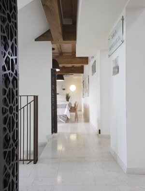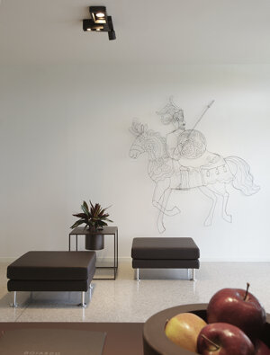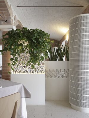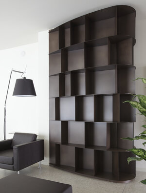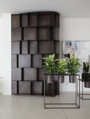 De Castelli, nella hall realizzazione di libreria Existence in acciaio maistral brunito, fornitura di vasi e fioriere in acciaio laccato bianco e maistral brunito.