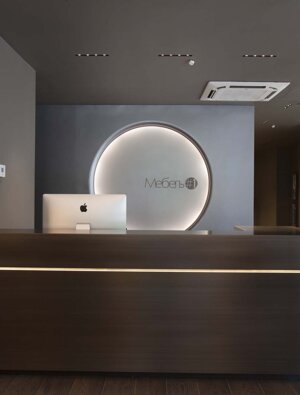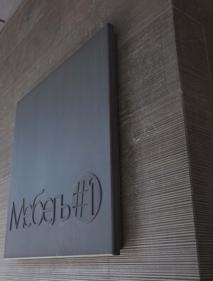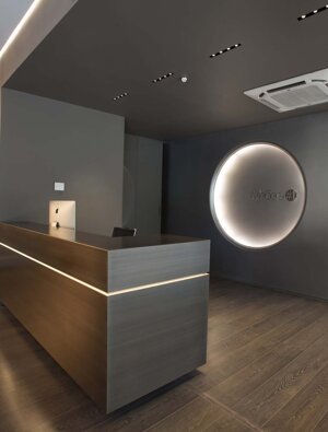 De Castelli, rivestimento reception in ferro délabré striato e insegne esterne in acciaio inox maistral striato.